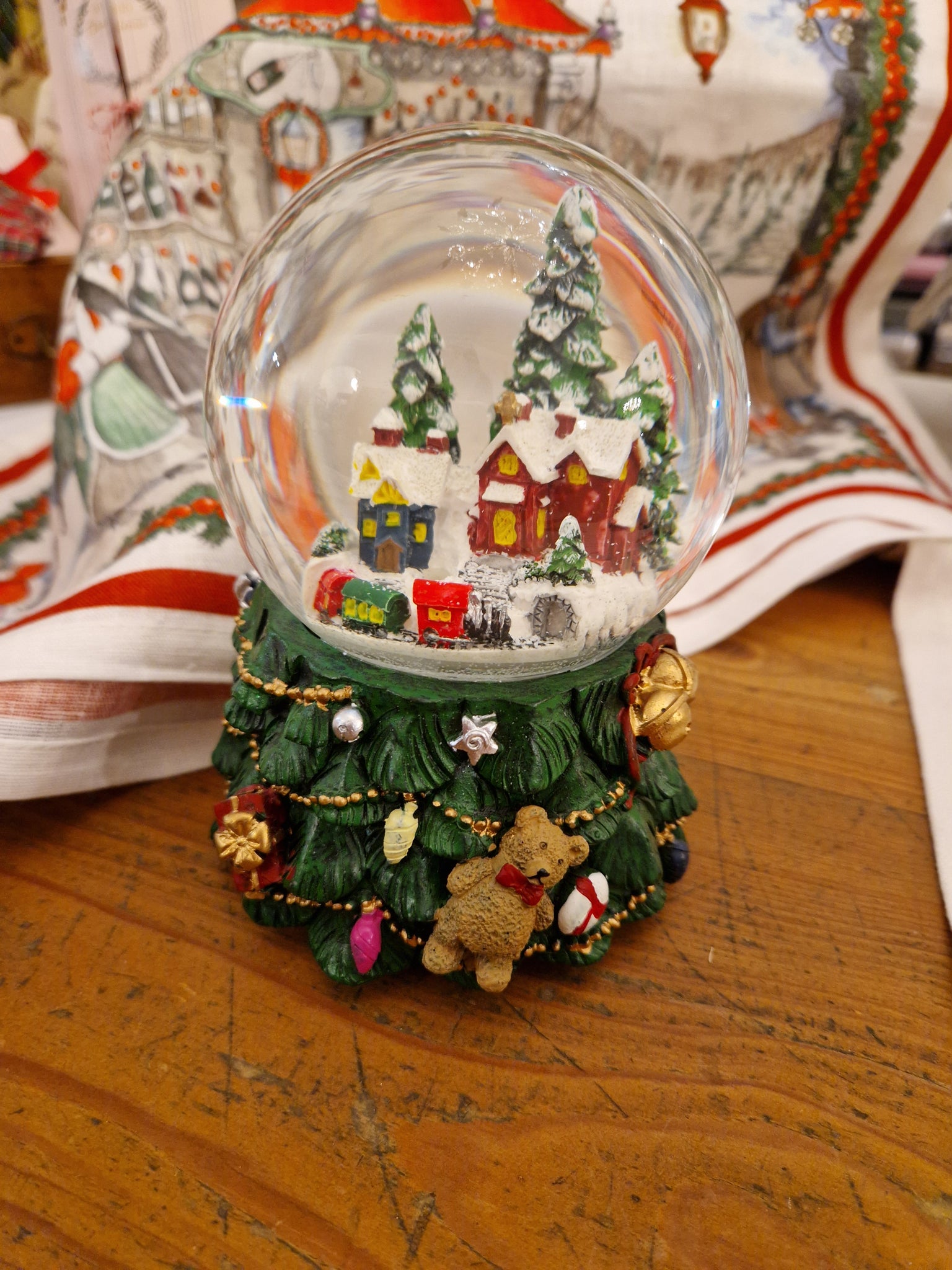 Palla di Natale con musica e luci, classico effetto neve automatico. Diametro circa 15 cm.